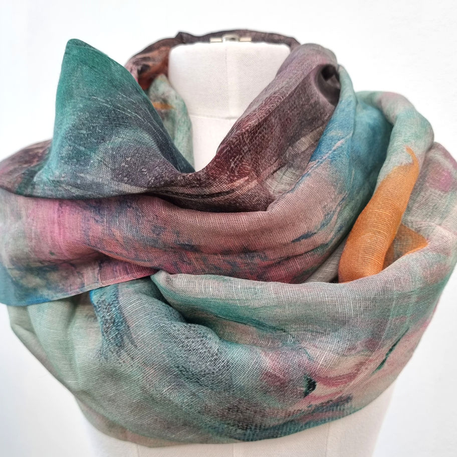 This scarf has print from the paintings made by Therese Enger.